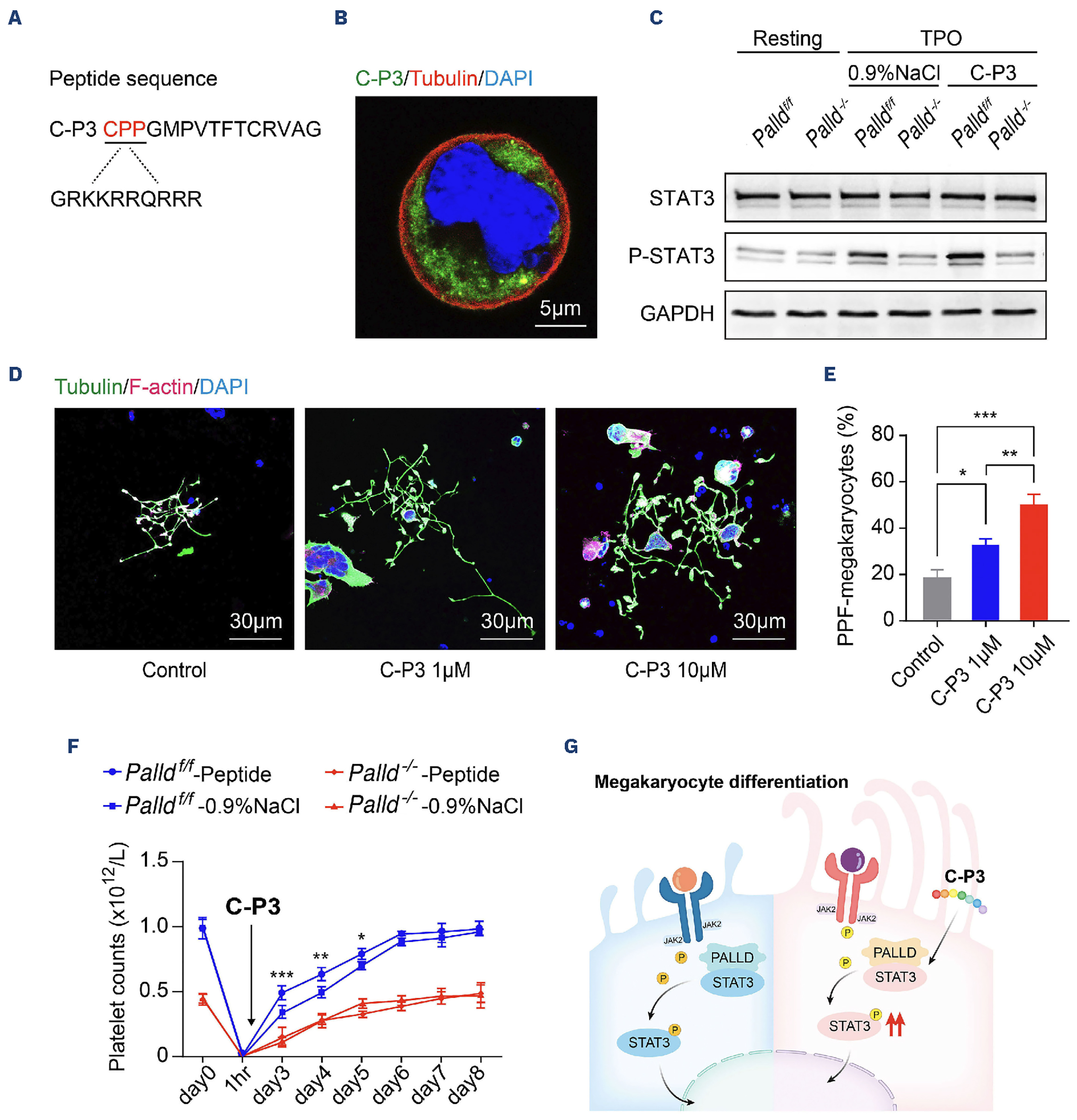 Figure 7.Peptide C-P3 promotes megakaryocyte differentiation and platelet production. (A) Sequences of peptide C-P3 fused to N-terminal cell-penetrating peptide (CPP). (B) Immunofluorescence (IF) images of α-tubulin (Rhodamine) in megakaryocytes treated with FITC-labeled C-P3. The scale bars represent 5 μm. (C) Western blot analysis of STAT3 phosphorylation level in Palldf/f and Palld-/- platelets incubated with 0.9% NaCl or C-P3. (D) IF images of fetal liver-derived megakaryocytes stimulated with phosphate-buffered saline (PBS) or 1 µM and 10 µM C-P3. Stained for α-tubulin (Alexa Fluor 488) and F-actin (Alexa Fluor 647). The scale bars represent 30 µm. (E) Quantitative analysis of the ratio of proplatelet-forming (PPF)-megakaryocytes to total megakaryocytes (N=6; *P<0.05, **P<0.01, ***P<0.001). (F) Platelets of Palldf/f and Palld-/- mice were eliminated by intravenous tail injection of anti-CD42b antibody (2 µg/g). After 36 hours, a bone marrow injection of C-P3 (20 µg/g) was performed. Platelet counts were measured at various time intervals (N=4; *P<0.05, **P<0.01, ***P<0.001). (G) Schematic diagram of peptide C-P3-in-duced enhancement of megakaryocyte differentiation.