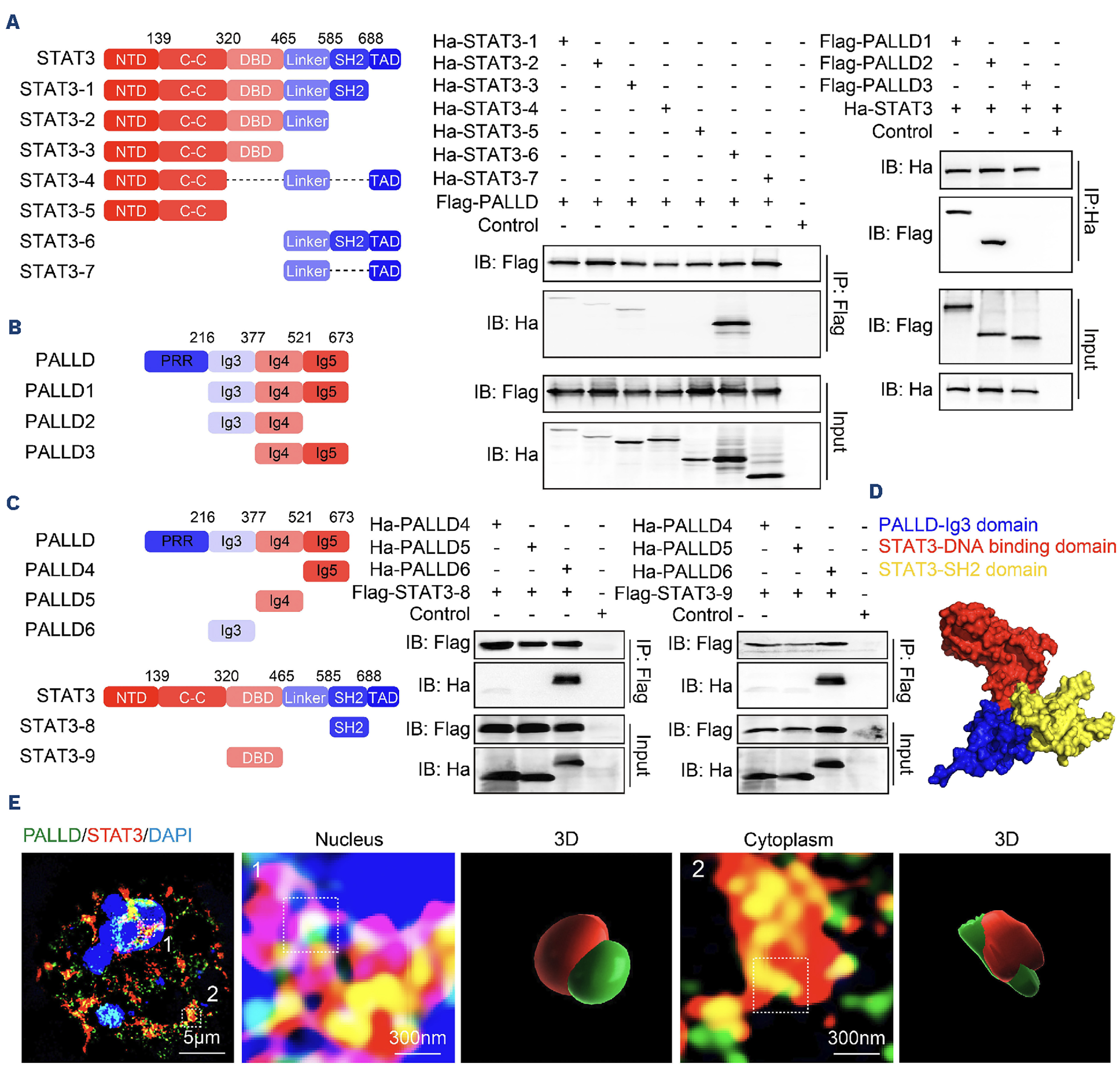 Figure 5.The Ig3 domain of PALLD binds to the DNA-binding domain and Src homology 2 domain of STAT3 in both the nucleus and cytoplasm. (A-C) Co-immunoprecipitation (Co-IP) of lysates from HEK293T cells transfected with the truncated forms of STAT3 or PALLD. (D) Surface-binding model of PALLD’s immunglobulin 3 (Ig3) domain with STAT3’s DNA-binding domain (DBD) and Src homology 2 (SH2) domain. (E) Immunofluorescence (IF) images of endogenous PALLD (Alexa Fluor 488) and STAT3 (Rhodamine) in megakaryocytes derived from fetal liver. The 3D-volume rendering of PALLD and STAT3 signals was performed using Imaris software. The scale bars represent 5 µm or 300 nm. PRR: proline rich region; NTD: N-terminal domain; C-C: coiled-coil domain; TAD: transactivation domain.