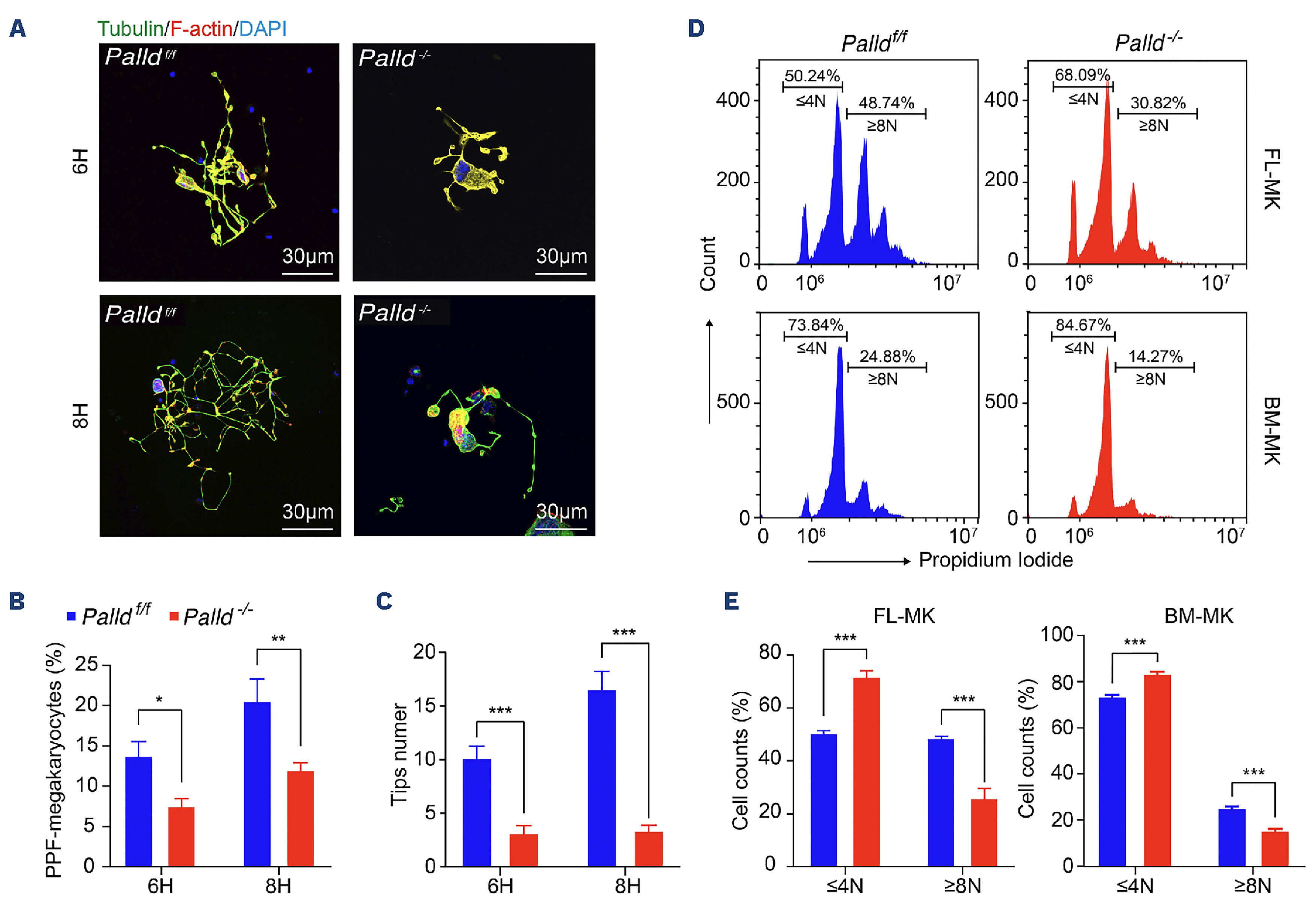 Figure 2.PALLD deficiency impairs megakaryocyte proplatelet formation and polyploidization. (A) Immunofluorescence (IF) images of proplatelet-forming (PPF) megakaryocytes derived from the fetal liver (FL-MK) of Palldf/f and Palld-/- mice, stained with α-tubulin (Alexa Fluor 488), F-actin (Rhodamine). The scale bars represent 30 µm. (B) Quantitative analysis of the ratio of PPF-megakaryocytes to total megakaryocytes (6 hours [6H], N=5; *P<0.05; (8 hours [8H], N=5; **P<0.01). (C) Number of proplatelet tips generated by Palldf/f and Palld-/- megakaryocytes (6H, N=5; ***P<0.001; 8H, N=5). (D) Representative gating strategy for propidium iodide staining of FL-MK and megakaryocytes from bone marrow (BM-MK) in Palldf/f and Palld-/- mice. (E) Quantitative analysis of the polyploidy ratio in megakaryocytes from fetal liver and bone marrow of Palldf/f and Palld-/- mice (N=4, ***P<0.001).