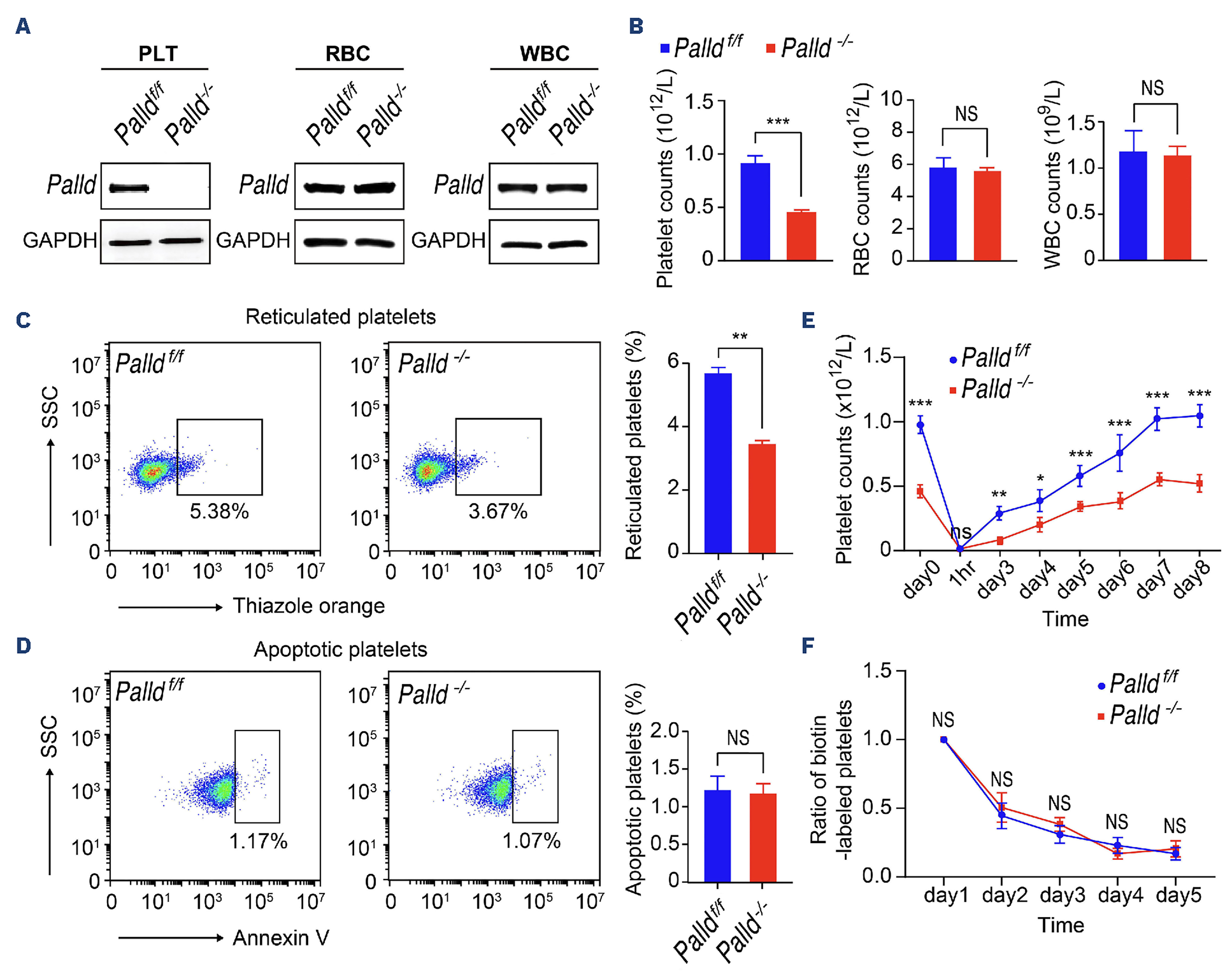 Figure 1.Impaired platelet biogenesis leads to thrombocytopenia in Palld-/- mice. (A) Western blot analysis of PALLD expression in platelets, red blood cells (RBC) and white blood cells (WBC) of Palldf/f and Palld-/- mice. (B) Platelet, RBC and WBC counts in Palldf/f and Palld-/- mice (N=7; ***P<0.001; NS: not significant). (C) Representative gating strategy of thiazole orange-stained cells and percentage of reticulated platelets in Palldf/f and Palld-/- mice (N=4; **P<0.01). (D) Representative gating strategy of annexin V-stained cells and percentage of apoptotic platelets in Palldf/f and Palld-/- mice (N=4). (E) Platelet counts at different time points after intravenous tail injection of anti-CD42b antibody (2 µg/g) (N=4; *P<0.05, **P<0.01, ***P<0.001). (F) Biotin-labeled platelets in mice at different time points after tail intravenous injection of Sulfo-NHS-LC-Biotin (N=4).