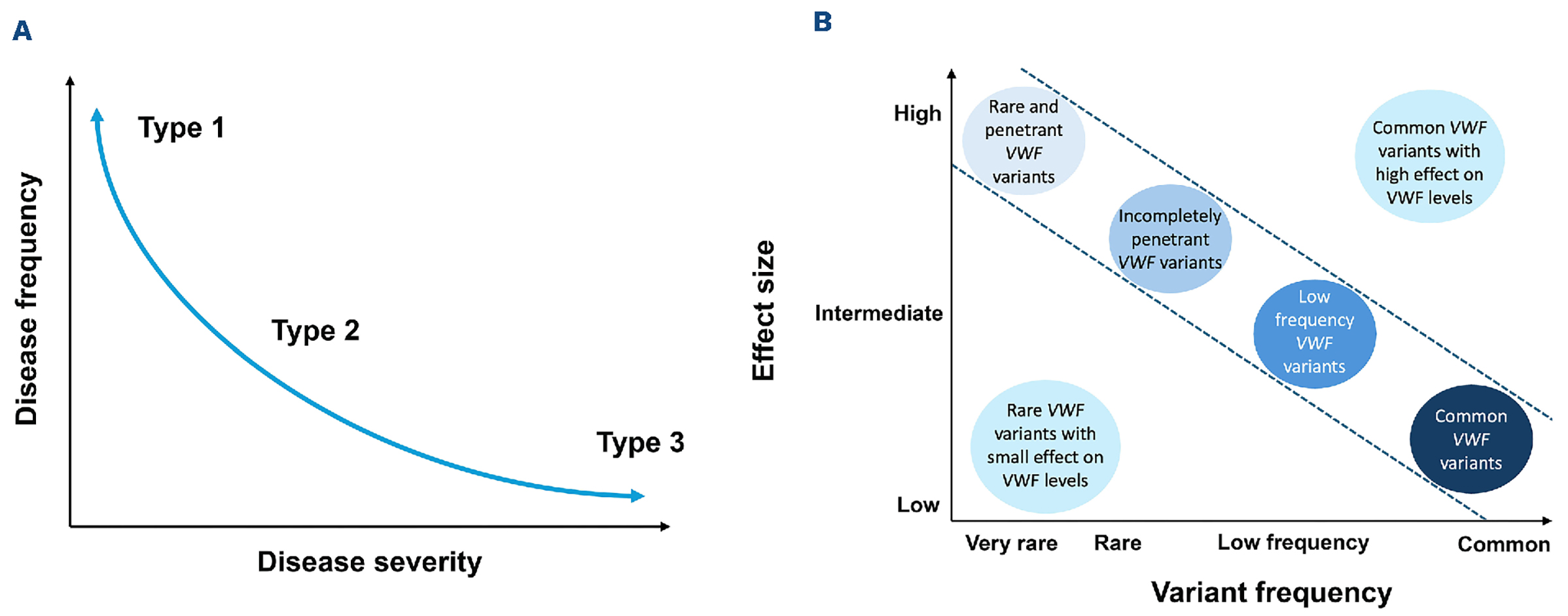 Figure 4.Correlation between disease frequency and severity and association of VWF genetic variants with allele frequency and their impact on von Willebrand factor levels. (A) The severity and frequency of von Willebrand disease (VWD) typically exhibit an inverse relationship: type 1 is the most prevalent but presents with the mildest bleeding symptoms, type 2 follows with moderate severity, and type 3, although the rarest, is associated with the most severe bleeding manifestations. (B) In severe cases of type 1 VWD, as well as in type 2 and type 3 VWD, rare VWF variants are almost always responsible for the disease. However, in mild forms of type 1 VWD (or Low VWF), variants often exhibit incomplete penetrance. It is important to note that being a rare variant does not necessarily imply causality, and only a few variants with a minor allele frequency up to 1% show a strong association with VWD. Additionally, some common VWF variants may contribute to (minor) variations in plasma von Willebrand factor (VWF) levels.