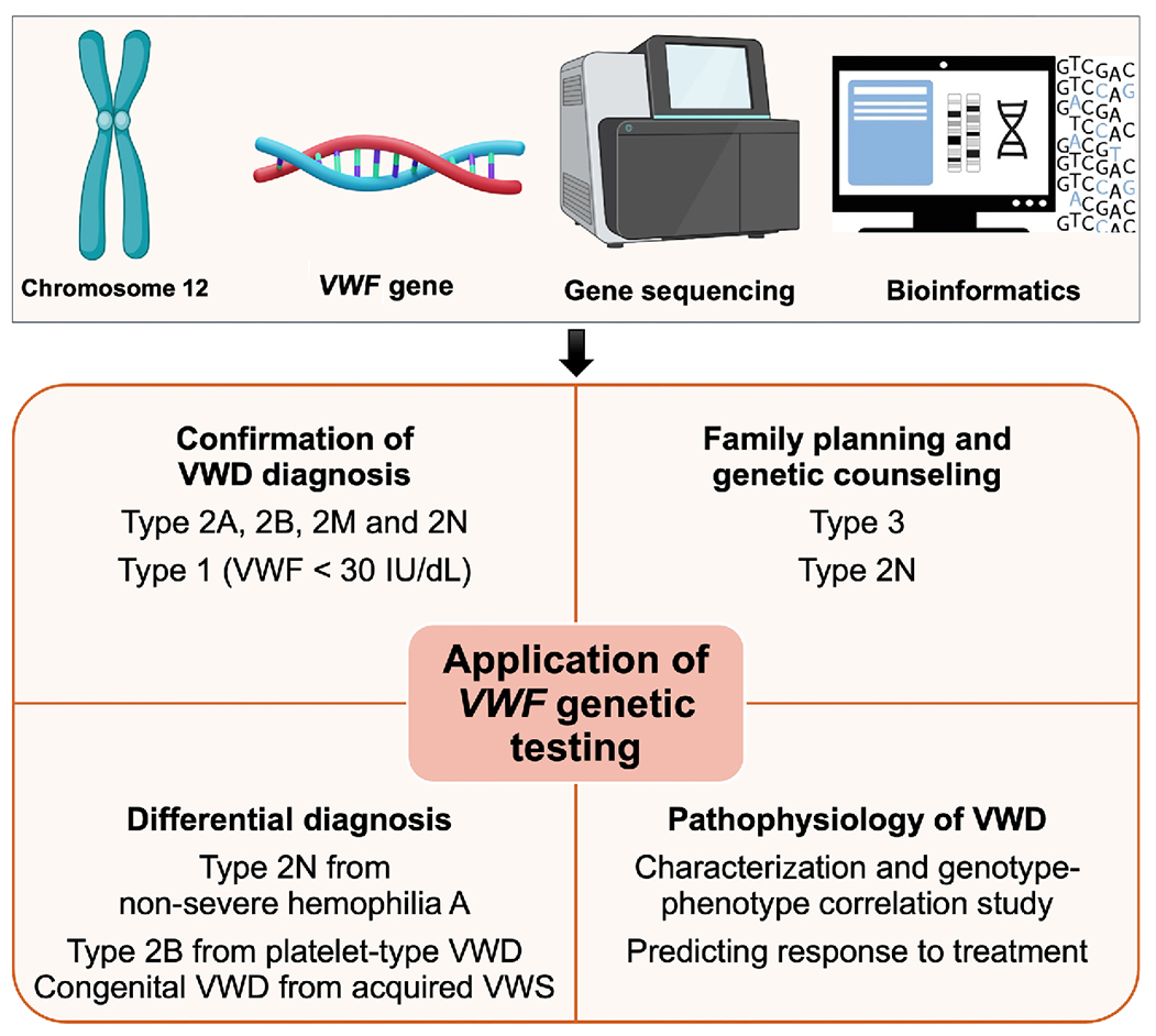 Figure 2.The application of molecular genetic testing of the VWF in von Wille-brand disease. VWF molecular testing is instrumental in confirming certain von Willebrand disease (VWD) diagnoses, facilitating differential diagnoses, and providing insights into the disease’s pathophysiology. It also plays a key role in genetic counseling and family planning for certain VWD types. Furthermore, it can enable personalized therapy for specific VWD phenotypes, such as type 2B and type 1C, in which desmopressin is contraindicated or offers limited benefit, respectively. VWS: von Willebrand syndrome.