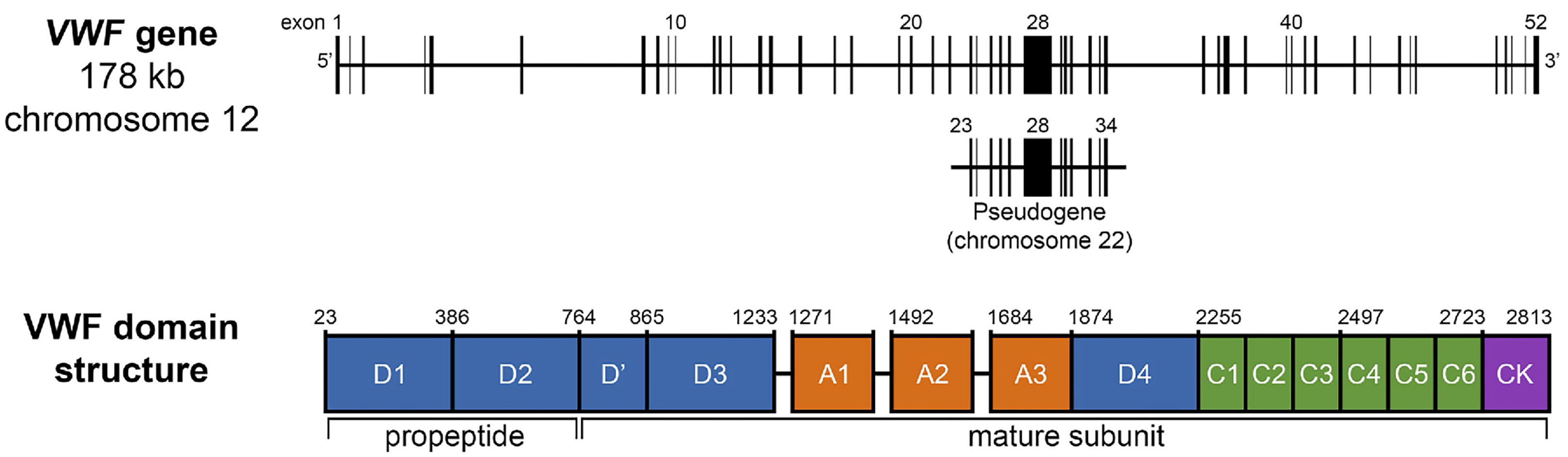 Figure 1.von Willebrand factor gene, pseudogene and protein. The VWF, located on chromosome 12 (12p13.31), spans approximately 178 kb. A partial unprocessed von Willebrand factor (VWF) pseudogene, mapped to chromosome 22 (22q11.2), extends about 25 kb and corresponds to exons 23 to 34 of VWF, sharing 97% sequence homology with the functional gene. The precursor of VWF is synthesized as a single-chain polypeptide, consisting of a signal peptide, a propeptide (D1–D2 domains), and a segment that forms the mature VWF subunit (D’–CK domains). Figure adapted, with permission, from Seidizadeh et al.15