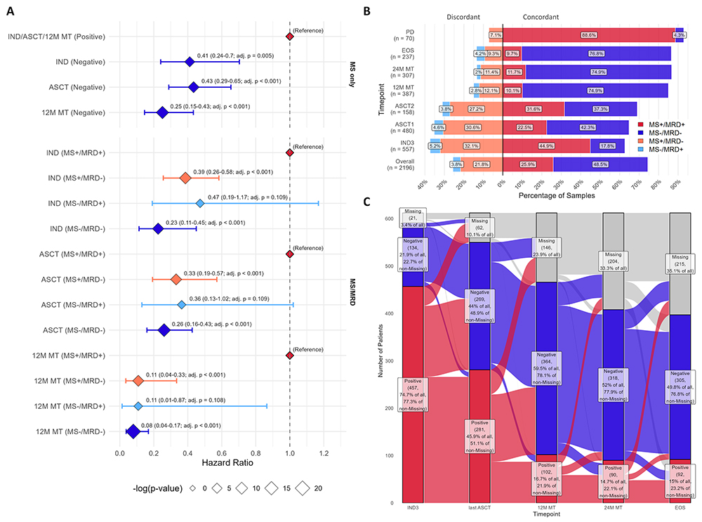 Methods. Serum MS was performed on 3,301 samples from 617 patients enrolled in the phase 3 GMMG-HD7 trial at baseline, post-induction (IND), post-autologous stem cell transplant (ASCT), 12 and 24 months of maintenance (12M MT, 24M MT), end-of-study (EOS), and at progressive disease (PD). MS-based MRA was assessed using the EXENT® system. Bone-marrow MRD was evaluated via Next-Generation Flow cytometry (sensitivity 10-5). Prognostic impact on progression-free survival (PFS) was analyzed at predefined timepoints, alone and in combination with MRD. Multivariate Cox models were fitted considering age, sex, first randomization treatment arm and risk scoring (R-ISS), separately for every landmark.
