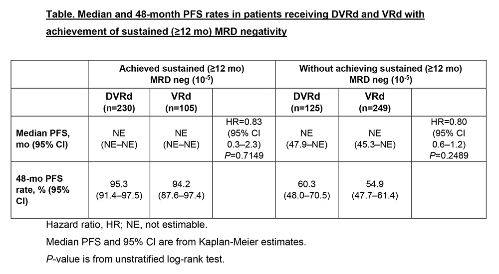 Results. A total of 709 patients were assigned to DVRd (n=355) or VRd (n=354). At 47.5-month median follow-up, ≥12-month sustained MRD negativity rates were higher overall with DVRd (64.8%; n=230) vs VRd (29.7%; n=105); this pattern persisted across clinically relevant subgroups, including age ≥65 years and high-risk cytogenetics. Similarly, ≥24-month sustained MRD negativity rates were higher with DVRd (55.8%; n=198) vs VRd (22.6%; n=80). Patients with ≥12-month sustained MRD negativity vs those without had improved 48-month PFS rates regardless of treatment arm (Table). Compared with VRd, DVRd reduced FHR rates (3.1% vs 6.8%), and rates of FHR or pre-progression deaths were lower with DVRd vs VRd (5.4% vs 11.0%) in the first 18 months.