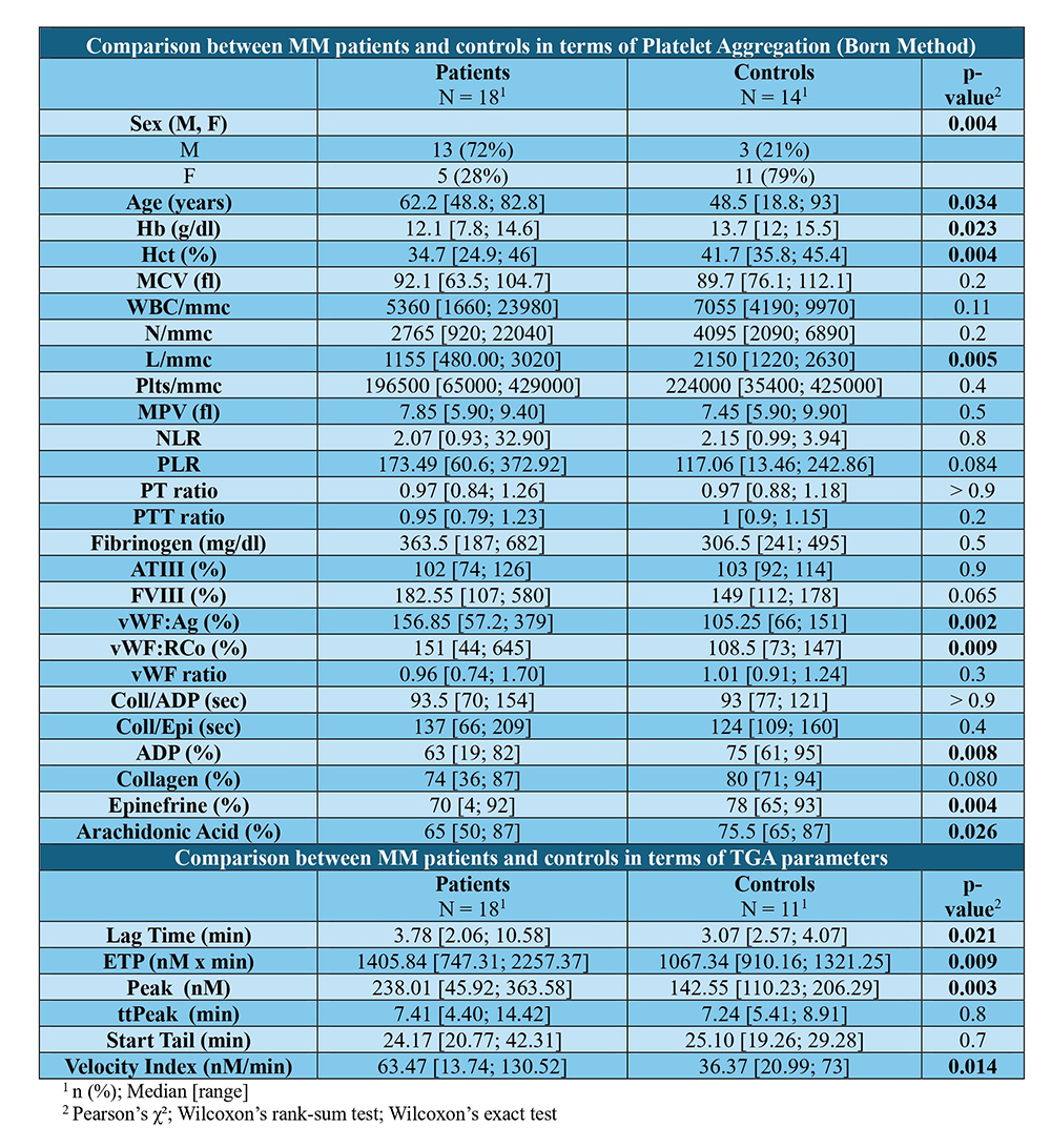 Conclusions. This study highlights the coexistence of hypercoagulability and platelet dysfunction in MM. Based on these preliminary results, the reduction of tumor burden and the treatment don’t seem to modify the evaluated parameters.