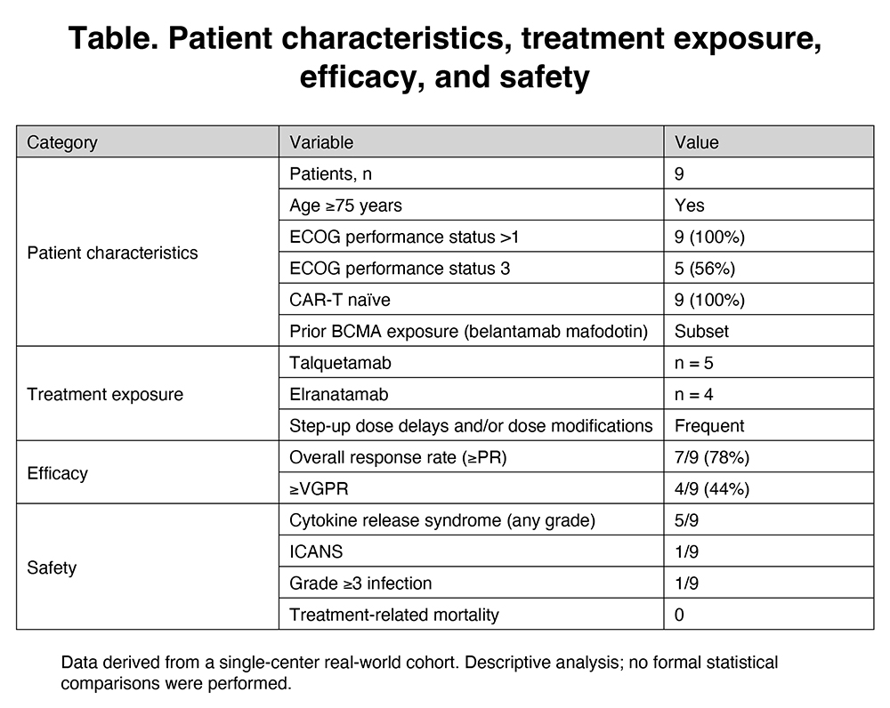 Bispecific antibodies (BsAbs) have demonstrated high efficacy in relapsed/refractory multiple myeloma (MM). However, patients with impaired performance status and clinical frailty are underrepresented in pivotal trials, which typically restrict enrollment to ECOG 0–1. As a result, evidence guiding BsAb use in frail and elderly patients – who represent a substantial proportion of real-world MM populations – remains limited. In particular, the feasibility of BsAb therapy in patients with ECOG >1, the need for treatment adaptations, and the impact of supportive care strategies are insufficiently characterized. We conducted a single-center real-world analysis of consecutive frail and elderly MM patients with ECOG performance status (PS) >1 treated with BsAbs between 2024 and 2026. Frailty was defined pragmatically by age ≥75 years and/or ECOG PS ≥2. Patients received talquetamab or elranatamab according to institutional practice. All patients were CAR-T naïve, and a subset had prior BCMA exposure with belantamab mafodotin. Data collection included baseline clinical characteristics, treatment exposure, step-up delays and dose modifications, safety outcomes, and treatment response assessed according to standard clinical criteria. All patients received immunoglobulin replacement therapy. In addition, viral (including CMV) and fungal molecular surveillance was performed prior to treatment initiation and at each febrile episode. Analyses were descriptive, with exploratory subgroup evaluation of patients with ECOG PS 3. Nine patients were included; five received talquetamab and four elranatamab. Five patients (56%) belonged to a high-risk ECOG PS 3 subgroup. Step-up dose delays and/or dose modifications were frequently required, reflecting advanced age, comorbidities, and functional impairment. Overall response rate was 78% (7/9), with ≥VGPR achieved in 44% (4/9). Responses were observed across the ECOG >1 population, including within the high-risk ECOG PS 3 subgroup, despite frequent treatment adaptations. Treatment initiation was feasible in all patients, including those with advanced frailty and ECOG PS 3. No patients discontinued therapy during step-up dosing due to intolerance, and treatment exposure was maintained despite frequent dose adaptations. Dose delays and modifications were implemented primarily to mitigate toxicity risk rather than in response to severe adverse events. Cytokine release syndrome occurred in five patients and was predominantly low-grade. Immune effector cell-associated neurotoxicity syndrome was observed in one patient. One patient experienced a grade ≥3 infection. No unexpected toxicities, early treatment discontinuations due to toxicity, or treatment-related mortality were observed. In this real-world cohort of frail and elderly MM patients with ECOG >1, BsAb therapy demonstrated clinically meaningful efficacy with manageable toxicity when individualized dosing and proactive supportive care strategies were applied. Poor performance status alone should not automatically preclude BsAb therapy. These findings support the feasibility of BsAbs in frail populations traditionally excluded from clinical trials and highlight the need for prospective studies specifically addressing this high-risk group.