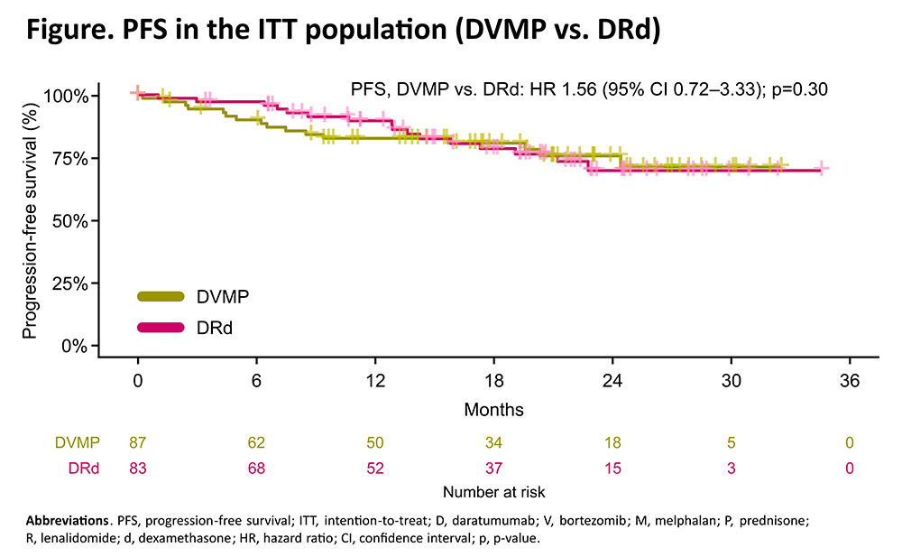 Results. At data cut-off (July 9, 2025), 170 pts received DVMP (n=87) or DRd (83). Baseline characteristics were balanced between DVMP and DRd arms: median age was 76 (range 64–90) vs 76 years (range 63–87); 18% vs 13% of pts were aged >80 years; 37% vs 34% were frail; 27% vs 32% had high-risk cytogenetics. At a median follow-up of 19.3 months, no significant PFS differences were observed between DVMP vs DRd in the ITT population (HR 1.56, 95% CI 0.72–3.33, p=0.30; Figure). No significant differences were observed across age (> or ≤80 years), IMWG frailty score or cytogenetic-defined risk subgroups. The 6-month and 1-year PFS rates were 90% vs 97% and 83% vs 90% with DVMP vs DRd. In the first 6 months, 9 PFS events (2 progressive disease and 7 deaths) were observed [7/9 (78%) pts were frail; 7/9 (78%) events were observed in the DVMP arm]. In the ITT population, the 12-month NGF-MRD negativity rate was 25% with DVMP vs 30% with DRd (OR 1.79, 95% CI 0.81–3.94, p=0.15). Reaching MRD negativity within 12 months led to an improved PFS (vs MRD positivity: HR 0.12, 95% CI 0.03–0.50, p=0.004). No new safety concerns were reported.