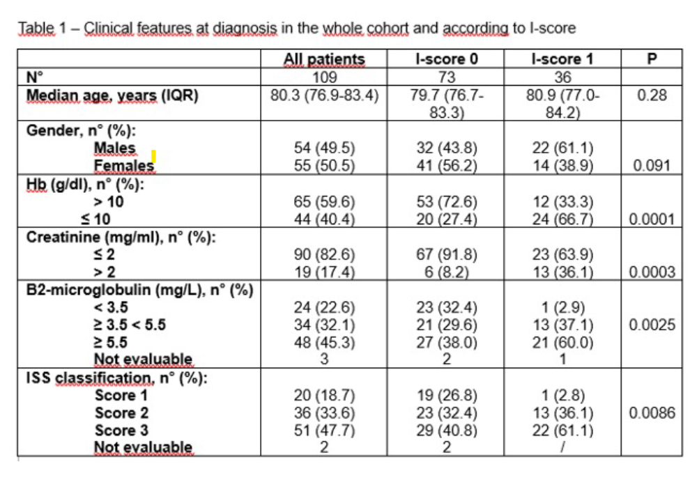 Results. Among the 109 patients, 73 (66.9%) had an I-score 0 and 36 (33.1%) an I-score 1. The main clinical features at diagnosis of the whole cohort and according to I-Score groups are reported in the Table: MM was preceded by MGUS and SM in 33,9% and 12,8% of the patients in the whole cohort, without differences between the two I-score groups. No difference was also observed between the two I-score groups as to median age (79.7 vs 80.9 years, p0.28). Patients in the I-score 1 had a significant higher rate of anemia (Hb ≤10 g/dl), renal impairment (creatinine levels > 2 mg/L) and β2 microglobulin elevation (p<0.0001, p 0.0003 and p 0.0025, respectively). In addition, the I-score 1 group had a higher rate of ISS 3 compared to the I-score 0 group (p=0.0086). As to treatment, 34 patients (31.19%) received dara-based triplets, 38 (34.8%) bortezomib-based doublets, 25 (22.9%) lenalidomide-based schemes and 12 (11%) MP and other low dose therapy. At the last follow-up, 67 patients (61,64%) are still alive, 5 (4,6%) were lost to follow-up and 36 (33%) died. Median OS of the whole cohort was 47.0 months (95%CI 32.0 – 65.0). Median OS of the I-score 0 group was 51.9 months (95%CI 38.3 – 72.3) compared to 30.2 months (95%CI 12.6 – 68.8) of I-score 1 group (p=0.0083).