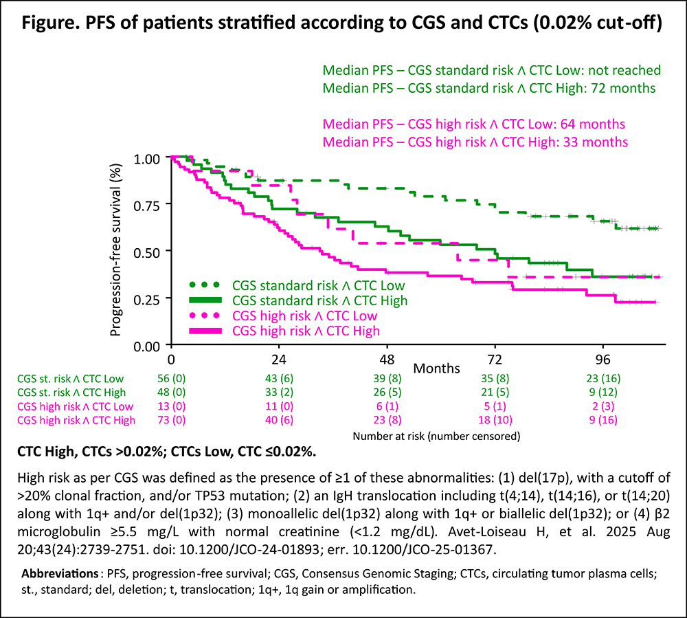 Results. In the R2-ISS cohort, 17% of pts had R2-ISS stage I, 28% II, 46% III and 9% IV. The distribution of pts with ≤0.001%, ≤0.01%, ≤0.1%, ≤1% and >1% of CTCs was 20%, 20%, 31%, 18% and 10%. After a median follow-up of 49 months, both CTCs log10 increments (HR 1.16 [95% CI 1.11–1.22]; p<0.001) and R2-ISS (R2-ISS II vs I: HR 1.19 [95% CI 0.93–1.53]; III vs I: 1.69 [1.34–2.14]; IV vs I: HR 2.78 [2.08–3.72]; p<0.001) were independent predictors of PFS in a multivariable model including center, transplant eligibility, treatment regimen and age. A PFS model including CTCs as log10 intervals + R2-ISS (C-index 0.708) or CTCs with a binary cut-off + R2-ISS (C-index 0.703) performed better than R2-ISS alone (C-index 0.695, likelihood ratio test vs R2-ISS p<0.001). Using a 0.02% cut-off, in R2-ISS I 78% vs 22% of pts had low vs high CTCs (median PFS: 99 vs 72 months); in R2-ISS II 60% vs 40% (median PFS: 78 vs 48 months); in R2-ISS III 41% vs 59% (median PFS 40 vs 32 months); in R2-ISS IV 22% vs 78% (median PFS 24 vs 15 months; p<0.001). In the CGS cohort, 45% of pts were at high risk. The distribution of pts with ≤0.001%, ≤0.01%, ≤0.1%, ≤1% and >1% of CTCs was 17%, 9%, 31%, 29% and 13%. After a median follow-up of 91 months, both CTC log10 increments (HR 1.31 [95% CI 1.13–1.52]; p<0.001) and CGS high risk (1.55 [1.01–2.39]; p=0.047) were independent predictors of PFS. A PFS model including CTCs as log10 intervals + CGS (C-index 0.669) or CTCs with a binary cut-off + CGS (C-index 0.650) performed better than a model with CGS alone (C-index 0.620, likelihood ratio test vs CGS p<0.006). Using a 0.02% cut-off, 29% of pts were classified as CGS standard risk + low CTCs, 25% as CGS standard risk + high CTCs, 7% as CGS high risk + low CTCs and 38% as CGS high risk + high CTCs. Median PFS was not reached in CGS standard risk + low CTCs, 72 months in CGS standard risk + high CTCs, 64 months in CGS high risk + low CTCs and 33 months in CGS high risk + high CTCs (p<0.001; Figure).
