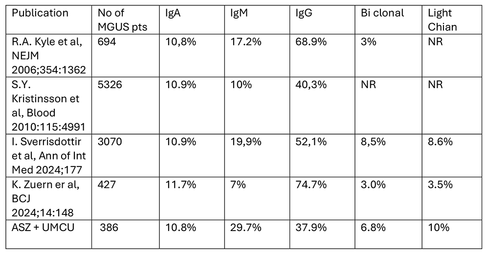 Conclusions. This analysis demonstrates, probably due to different a priori change or due to different use of diagnostic tools, that the detection of a hematological malignancy and MGUS related disease is different between hospitals: 4,3% in the ASZ and 11.5% in the UMCU. For both hospitals more patients with IgM MGUS are reported compared to literature. Remarkably, 40.5% of patients with an IgM M protein are being referred by neurology, but without a clear increase in diagnosis of IgM MGUS neurological related diseases.