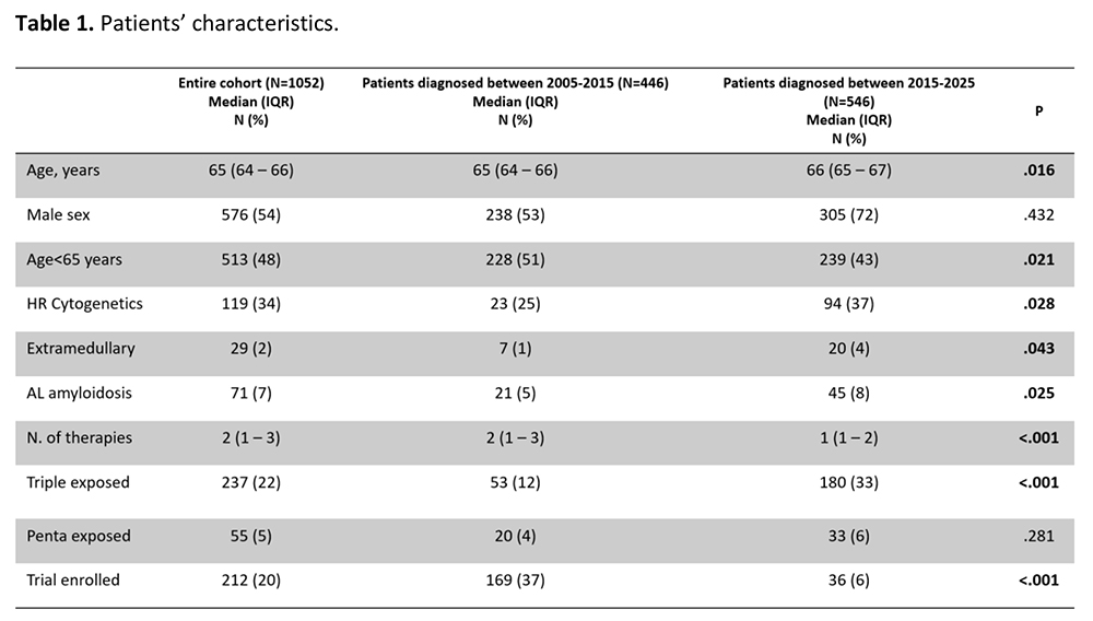 In the last two decades therapeutic armamentarium for treatment of multiple myeloma (MM) is increased both with the introduction of novel drugs and combinations and by introducing consolidation and maintenance therapy. Life expectancy and outcomes of MM patients has remarkably improved. Particularly, maintenance therapy, either such as continuous upfront therapy in transplant ineligible patients or after an induction intensified therapy, has demonstrated to have a pivotal role in improving patient survival either upfront or at relapse. Moreover, the efficacy of new therapies induced a decrease in relapse and refractory (RR) patients We investigated patient characteristics and treatment durations in our center between January 2005 and September 2025. A total of 1052 patients were evaluated. The majority of patients were managed in a real-world setting, outside the context of controlled clinical trials. Patients were divided into two cohorts according to the year of diagnosis, reflecting distinct therapeutic eras. Group A: patients diagnosed and treated between 2005 and 2015; group B: patients diagnosed and treated between 2016 and 2025. Overall survival (OS) was calculated from diagnosis to death or last contact. Time to next treatment (TTNT) was defined as the time from initiating treatment to initiating the next line of therapy. A total of 1052 patients were included: 446 in group A and 546 in group B. Baseline characteristics are reported in Table 1. Median age at diagnosis was 65 years, with 52% of patients aged >65; 54% were male. Cytogenetic data by FISH were available for 497 patients, with greater availability in the later era. Patients received a median of two lines of therapy (range 1–3); approximately 25% were triple-exposed and 5% penta-exposed. Overall, 22% of patients were enrolled in clinical trials. After a median follow-up of 107 months (95% CI: 98–243), median OS for the entire cohort was 65 months (95% CI: 58–69). Considering patients <65 years, median OS was superior in group B compared to group A (not reached vs 75 months, p<0.001). Autologous stem cell transplantation (ASCT) was performed in 338 patients, 43% of whom received tandem ASCT. Patients who underwent ASCT showed a significantly longer overall survival compared with those who did not receive ASCT in both groups (group A: 95 vs 49 months, p<0.001; group B: not reached vs 41 months, p<0.001).Clinical trial participation conferred an OS benefit across both cohorts (group: A 50 vs 80 months, p<0.001; group: B 63 vs 107 months, p <0.001). In RRMM, TTNT progressively shortened with advancing lines of therapy, reaching a median of 4 months after third-line treatment. Beyond the eighth line, TTNT appeared to stabilize, likely reflecting the impact of novel drugs. Sixteen patients received bispecific antibodies across multiple lines (second to tenth); in this subgroup, median progression-free survival was not reached. In the ninth line, TTNT increased from 4 months in the overall population to 11 months in bispecific-treated patients, suggesting a meaningful clinical benefit despite small sample size and limited statistical power. This 30-year single-center real-world analysis highlights the continuous improvement in MM outcomes driven by therapeutic innovation. The sequential integration of IMiDs, proteasome inhibitors, monoclonal antibodies, cellular therapies, and bispecific antibodies has reshaped treatment strategies and survival expectations in routine clinical practice.