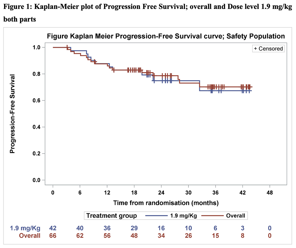 Results. To-date, 42 pts overall (part 1, n=12; part 2, n=30) received belamaf at the RP2D with Rd. Median follow up was 38.4 months (range 13.2-44.1) in part 1 and 19.7 months (range 3.9-26.4) in part 2. Median belamaf exposure was 12 doses in part 1, and 7 doses in part 2. Median dose intensity was 0.6 mg/kg/Q4W in both parts, with median relative dose intensity of 59.4% (range 44.0–89.7) and 51.3% (range 34.1–73.5), respectively. For pts treated at 1.9 mg/kg across both study parts, overall response rate (≥PR) was 97.6% (41/42 pts); 15 pts (35.7%) showed a sCR, 6 pts (14.3%) a CR, 16 pts (38.1%) a VGPR, 4 pts (9.5%) a PR. MRD negativity was achieved in 50% pts (6/12) in part 1, 40% pts (12/30) in part 2. The median time to first response was 1.0 month (range 0.9-3.8) and time to best response was 9.7 months (range 1.0-28.3). Median PFS & TTP were not reached. 18- and 24-month PFS were 82.9% (95%CI: 67.5-91.5) and 74.9% (95%CI: 56.3-86.5), respectively. TTP was 97.2% (95%CI: 81.9-99.6) for both 18- and 24 months. Belamaf administration frequently shifted beyond the normal Q8W schedule due to the OAE-guided holds: within the 1.9 mg/kg cohort (n=42) re-infusion intervals varied widely (8-19 weeks: coefficient of variation (CV) >20% in 32/42 pts) but stabilized beyond 12 months (CV<20% in 21/28 pts). Dose holds occurred in 32.0% in part 1 (OAEs) and in 26.5% in Gr A (OAEs) versus 16.9% in Gr B (VRA-guided); no VRA-enabled dosing was subsequently withheld by ophthalmologists for grade ≥3 OAEs. Grade ≥3 OAEs without VRA-reported “substantial time” (>50% of time) were detected in 10/300 (3.3%) ophthalmologist assessments in Gr A and 2/251 (0.8%) in Gr B. Stopping driving or reading due to eyesight issues occurred in 0.0%-0.6% of the monthly assessments in both groups. Eight pts experienced fatal TEAEs, most commonly pneumonia (3 pts; 7.1%). Grade ≥3 BCVA decline and keratopathy were observed in 54 (13.2%) and 1 (0.3%) of assessments in part 1, and 17 (3.4%) and 1 (0.2%) in part 2, respectively. Grade ≥3 ocular symptoms were observed in 7 pts (58.3%) in part 1 and 9 pts (30%) in part 2. No patient had to discontinue treatment.