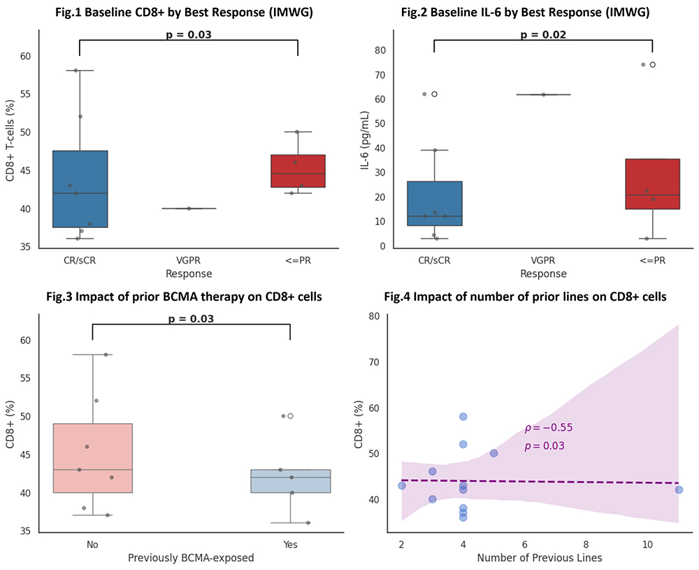 Results. Twelve patients were included (median age 74 years, range 54–80; 6 males), with a median of 4 prior therapy lines; 5 patients had prior BCMA-directed therapy. Eight patients received elranatamab and four teclistamab. Baseline CD8+ T-cell percentage differed significantly according to response: median 54% in CR/sCR, 45% in VGPR, and 38% in ≤PR (p=0.03, Figure 1). Baseline IL-6 levels were higher in inferior responders (median 12 pg/mL in CR/sCR vs 62 pg/mL in ≤PR; p=0.02, Figure 2). CD8+ inversely correlated with IL-6 (ρ=–0.62, p=0.01). Prior BCMA exposure and increasing number of previous therapy lines were associated with lower baseline CD8+ levels and reduced probability of deep response (ρ=–0.55, p=0.03; Figure 3-4). Patients with an “immune-favorable” profile (high CD8+, low IL-6) achieved CR/sCR even after multiple prior lines, whereas immune-unfavorable patients showed inferior outcomes. Longitudinally, responders maintained or increased CD8+ levels with declining IL-6 (Friedman p=0.04), while non-responders exhibited persistently low CD8+ and rising IL-6 (Friedman p=0.02).
