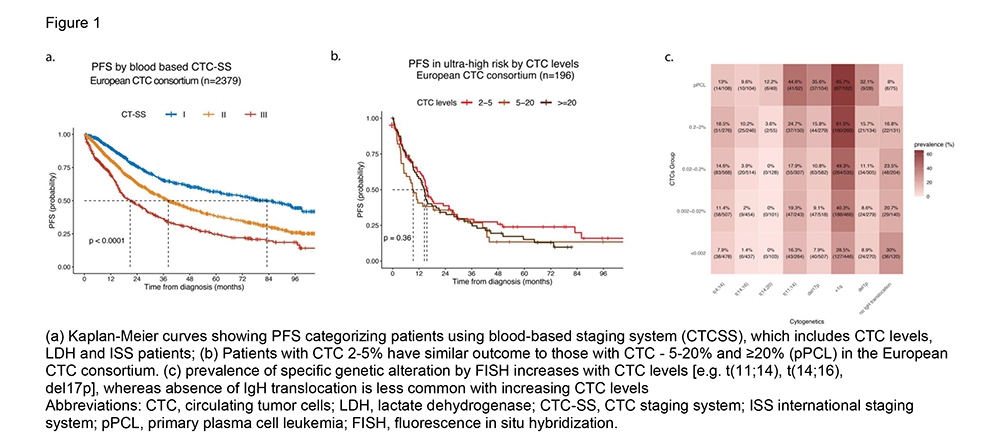 Conclusions. The CTC-SS provides a practical, blood-based staging tool for newly diagnosed MM when cytogenetic data are unavailable, performing comparably to R-ISS without the need of a bone marrow evaluation. Patients with CTC levels ≥2% show similar PFS outcomes with those >5% or >20%, suggesting that a log-scale approach or scoring system which incorporate the actual level of CTC may better discriminate prognosis. These findings, together with the continuum of genetic alterations, support the hypothesis that pPCL represents the extreme end of a biological spectrum rather than a separate disease entity.