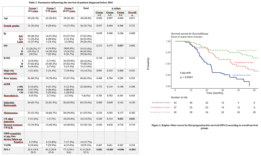 Patients and Methods. We performed a retrospective dual-center analysis among newly diagnosed MM patients who were diagnosed before 2010 and had received autologous stem cell transplantation within our database of 1554 consecutive NDMM patients. 110 patients meeting these criteria were stratified by overall survival (OS): 0–5 years (Group 1, n=43), 5–10 years (Group 2, n=27), and 10–15 years (Group 3, n=40). Baseline characteristics, treatment strategies, depth of response, first progression-free survival (PFS-1), and available MRD data are compared. Maintenance treatment was not approved until 2018 in Turkiye post-ASCT patients.