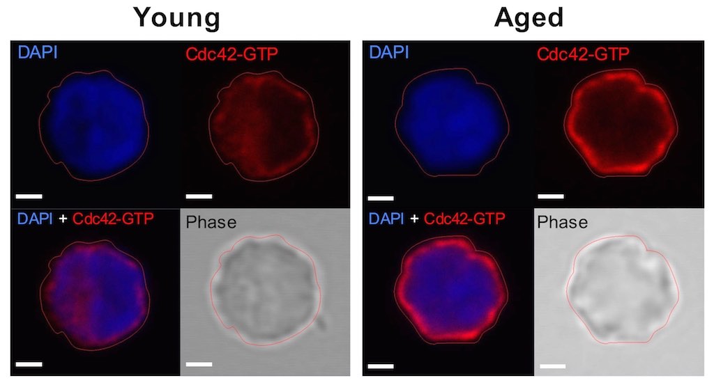 Hematopoietic stem cells (HSC) maintain blood homeostasis and show an age-related decline in overall function. This study characterized age-related changes in human and murine HSC. The data reported support the possibility of rejuvenating the function of aged human HSC by inhibiting the age-related increase in Cdc42 activity.