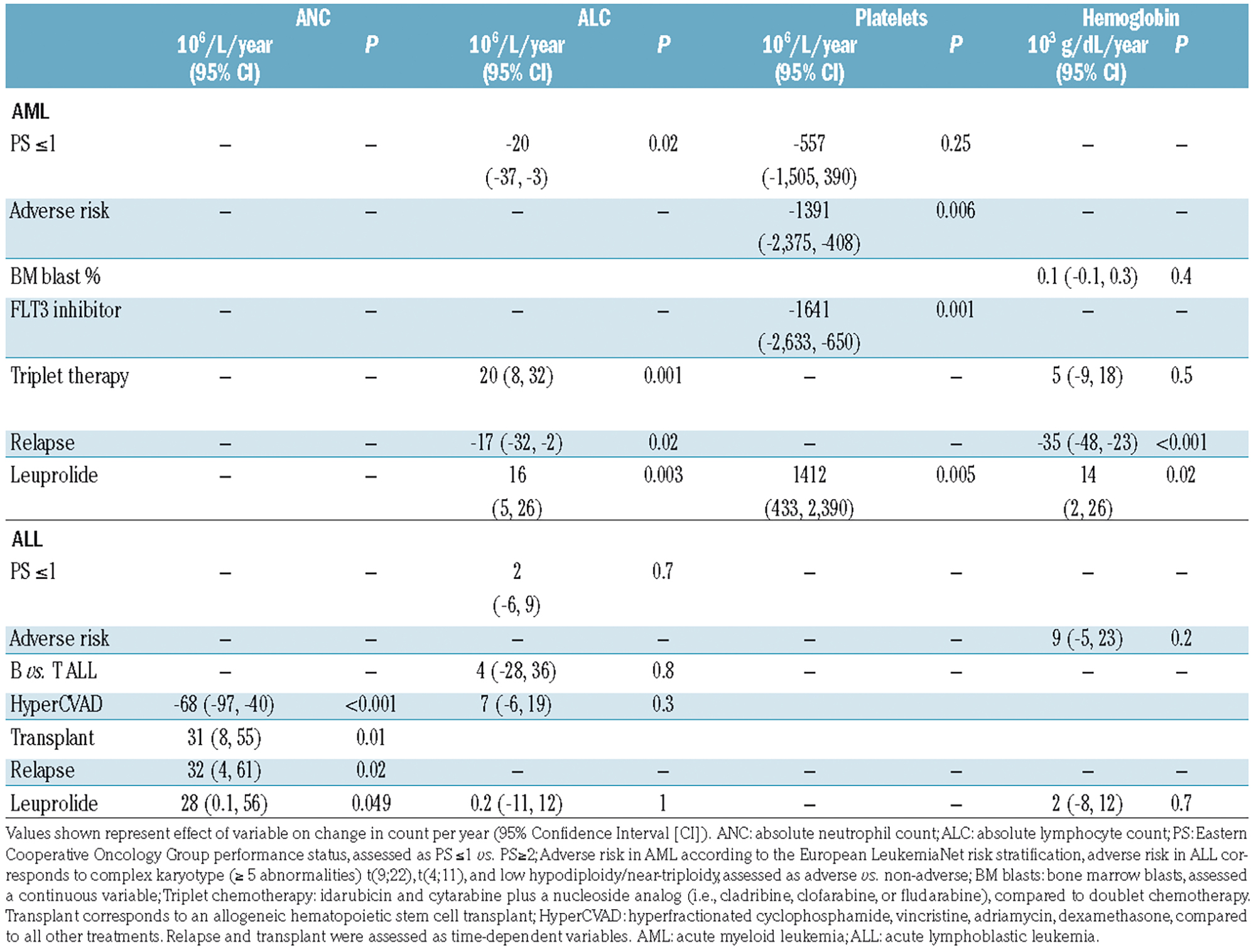 Given that numerous factors such dose of leuprolide, age or relapse status for example could affect count recovery and the possible association with leuprolide, we performed a univariate analysis followed by a multivariate analysis for significant factors impacting long-term count recovery. We examined whether leuprolide dosing (higher cumulative leuprolide dose) or timing of administration of leuprolide (between day -7 and day 15 of induction chemotherapy compared to leuprolide given later) correlated with long-term count recovery and found no statistically significant associations in the univariate analysis (Online Supplementary Table S3). Patients with AML who received FMS-like tyrosine kinase 3 (FLT3) inhibitors in addition to their chemotherapy had lower platelet recovery (P<0.001). Relapse status, investigated as a time dependent variable, was associated with lower long-term lymphocyte count and hemoglobin levels in AML (P=0.04 and P=0.01 respectively) and higher neutrophil count recovery in ALL (P=0.001). The full results of the univariate analysis are included in Online Supplementary Table S3. We next sought to assess the differential impact of leuprolide on count recovery when all co-factors are considered. We found that leuprolide administration was independently associated with long-term hemoglobin levels, lymphocyte and platelet counts in AML (P=0.02, P=0.003, and P=0.005, respectively) and ANC levels in ALL (P=0.049) (Table 2). Additional independent co-factors identified in this analysis for AML included performance status, adverse risk according to the European LeukemiaNet classification, relapse status, and receipt of a FLT3 inhibitor or triplet chemotherapy. For ALL, independent factors included relapse or whether patients had an allogeneic stem cell transplant or were treated with HyperCVAD.