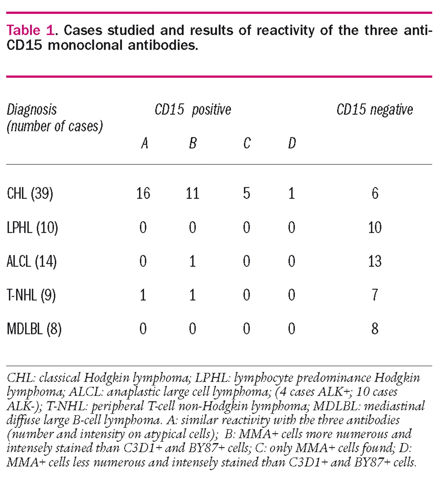 Table 1.Cases studied and results of reactivity of the three anti-CD15 monoclonal antibodies.
