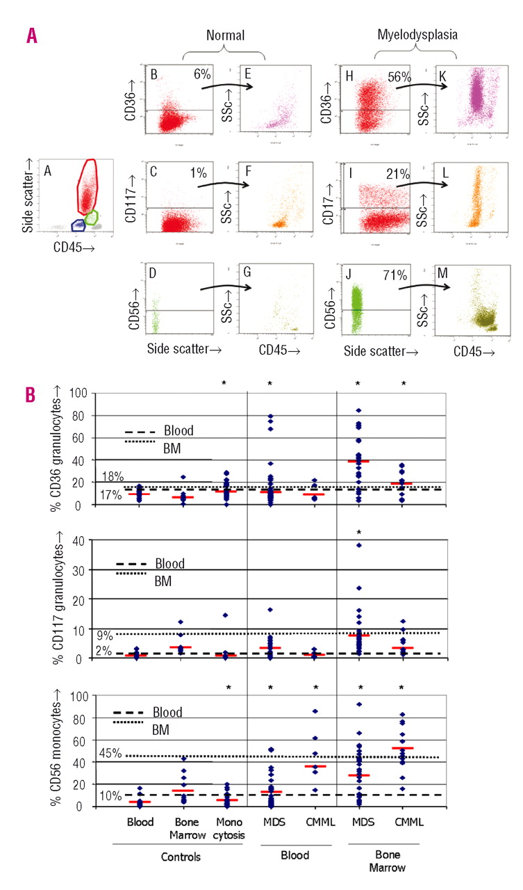 Figure 1.Phenotypic aberrations of bone marrow and blood cells in patients with myelodysplasia. 1A. Expression of CD36 and CD117 on granulocytes and CD56 on monocytes in normal and myelodysplastic bone marrow. Characterization of whole bone marrow cells was performed using a so-called triple color extensive panel comprising the CD45-Cy5.5 marker in association with the FITC/PE combinations CD36/CD11c, CD71/CD34, HLA-DR/CD117, CD36/GlycophorinA, CD66b/CD16, CD15/CD33, CD11b/CD13 CD34/CD7, CD19/CD56, CD14/CD38. Cells were primarily gated from a CD45/SS dot-plot (panel A), with granulocytes corresponding to CD45+/SShigh events (red gate), monocytes to CD45+/SSint events (green gate), and blast cells to CD45low/SSlow events (blue gate). Expression of CD36 and CD117 on granulocytes was assessed on SS/CD36 (panel B and H) and SS/CD117 (panel C and I) dot plots respectively. Expression of CD56 on monocytes was assessed on SS/CD56 dot plots (panel D and J). For each marker, gating from positive cells to CD45/Side Scatter (SSc) dot plot was performed, as shown in panel E, F, G, K, L and M. An example of a normal (panel B, C, D, E, F and G) and myelodysplastic (panels H, I, J, K, L and M) bone marrow sample is shown. Panels B, C, D, E, F and G are from the same subject. Panels H and K, I and L, and J and M are from 3 different patients, h and J from 2 patients with a RAEB-1, J from a patient with CMML. Threshold bars were set up on control unlabeled cells. Percentage of positive cells is given in the upper right corner of each graph. Results on blast cells are not shown. Abnormal percentages were defined as being higher than the mean + 2 standard deviation for the control (Table 1). 1B. Comparison of blood and bone marrow for CD36, CD56 and CD117 expression. Percentage of positive cells for expression of CD36 (upper panel) and CD117 (middle panel) on granulocytes as well as CD56 (lower panel) on monocytes from normal, reactive monocytosis and myelodysplastic (MDS, including CMML) blood and bone marrow samples. For each marker of each series of samples, the mean is indicated by a red (____ ) line. The threshold, corresponding to the mean plus 2SD, is indicated by a (……) line for bone marrow samples and by a (—) line for blood samples. Values of the different thresholds are indicated on the left of each (……) and (—) line. The * points series with statistically significant differences when compared to their respective normal control.