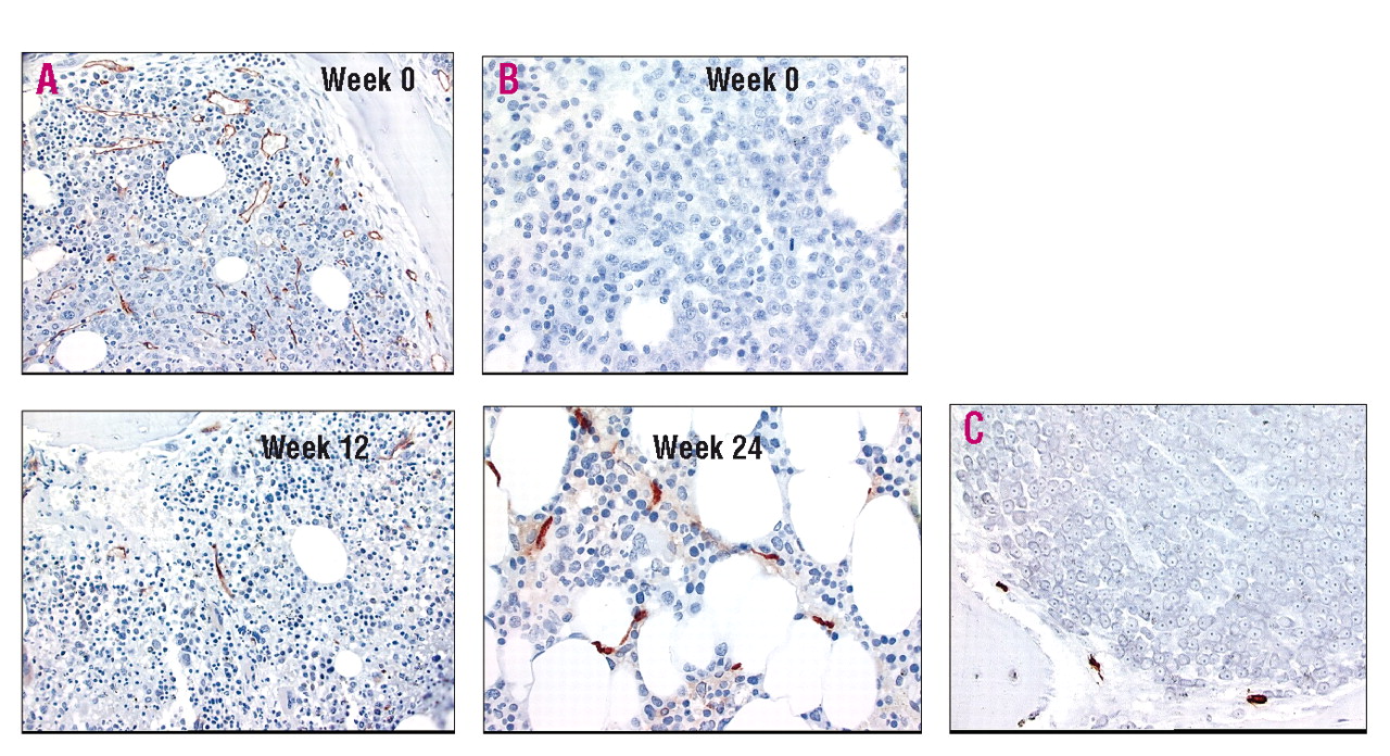 Figure 1.A. CD34 staining of bone marrow biopsy (×400 magnification) at study entry (top left) and week 12 (bottom left) in a patient demonstrating a partial response to thalidomide. B. Example of increasing mast cell numbers in a patient responding to thalidomide at baseline (top middle) and after 24 weeks of treatment (bottom middle). C. In patients with active myeloma, mast cells were most commonly observed only in areas of non-cellular marrow such as within paratrabecular regions (bottom right). Magnification ×400.