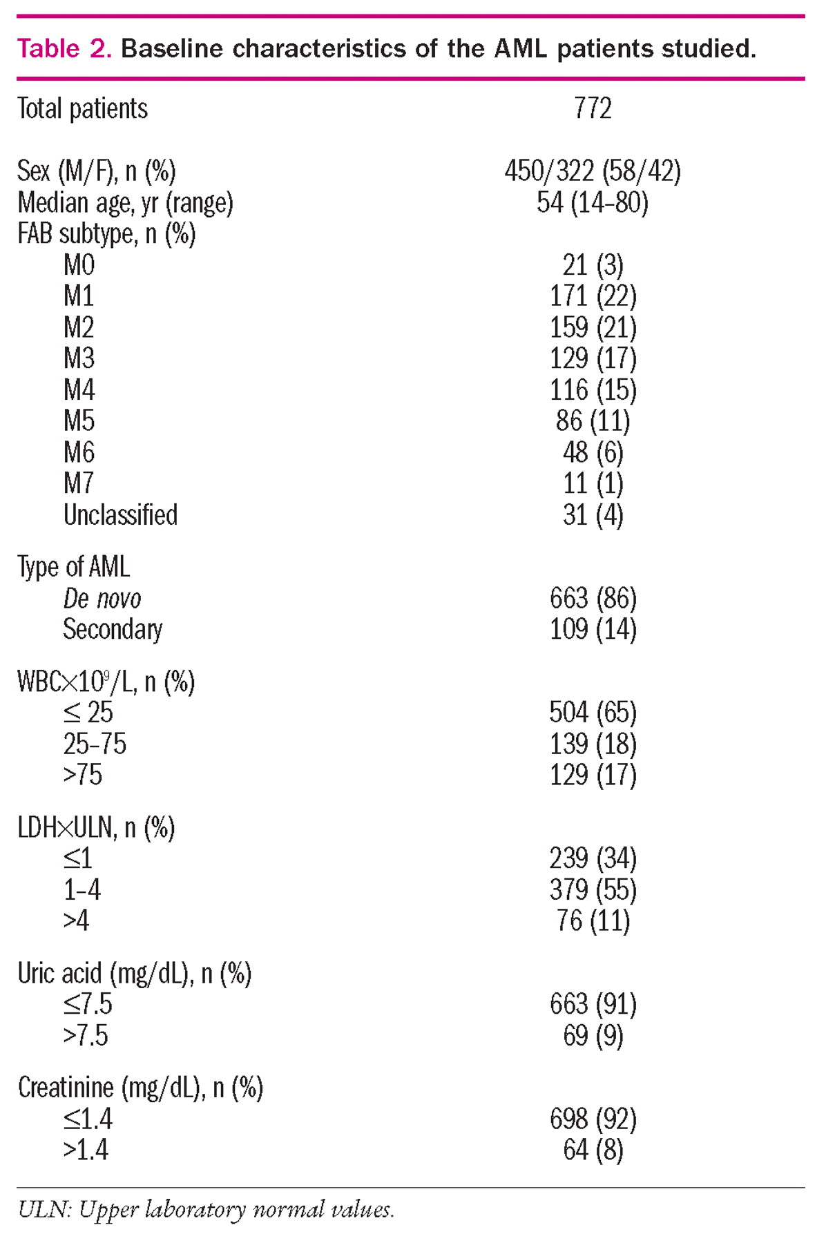 Tumor lysis syndrome (TLS) can be a life-threatening complication during induction chemotherapy in patients with acute leukemia. TLS is characterized by hyperuricemia, hyperkalemia, hyperphosphatemia, hypocalcemia and acute renal failure. These abnormalities may occur spontaneously before the initiation of chemotherapy due to increased catabolism and the turn-over of leukemic cells,1–3 but more frequently TLS is induced by intensive chemotherapy. Acute urate nephropathy is the main cause of renal failure during TLS, but calcium phosphate precipitation may also contribute to impaired renal function.4 The standard management of TLS includes generous hyperhydration, urine alkalinization and uric acid reduction with allopurinol. Despite these measures, TLS-related morbidity and mortality still occur in a sizeable proportion of patients with hematologic malignancies.5–7 However, few studies on TLS are focused on patients with acute myeloid leukemia (AML), and the incidence and outcome of TLS in this population is not well defined.8,9 With the introduction into clinical practice of new agents, such as recombinant urate oxidase (rasburicase),10 for the prevention or treatment of TLS, there has been an increased interest in defining the population at high risk of TLS. As TLS is thought to be uncommon in AML, risk factors for TLS have been extrapolated to AML from studies performed in patients with lymphoid malignancies.6,11,12 Therefore, efforts to define the specific risk factors for TLS in patients with AML are required. We performed a single-center retrospective chart review study with the aim of: (i) analyzing the incidence, characteristics and outcome of TLS in a large series of patients with AML homogeneously managed with hyperhydration and allopurinol, (ii) identifying risk factors for the development of TLS in patients with AML, and (iii) developing a new, simple scoring system for routine clinical use, allowing for risk-adapted management of this complication.