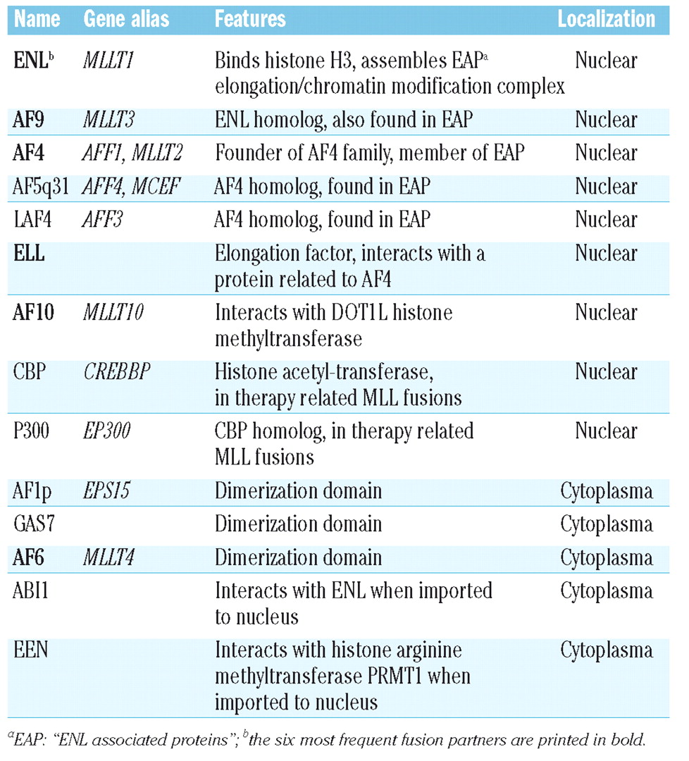 Table 1.A selection of MLL fusion partners with known functions or domains.