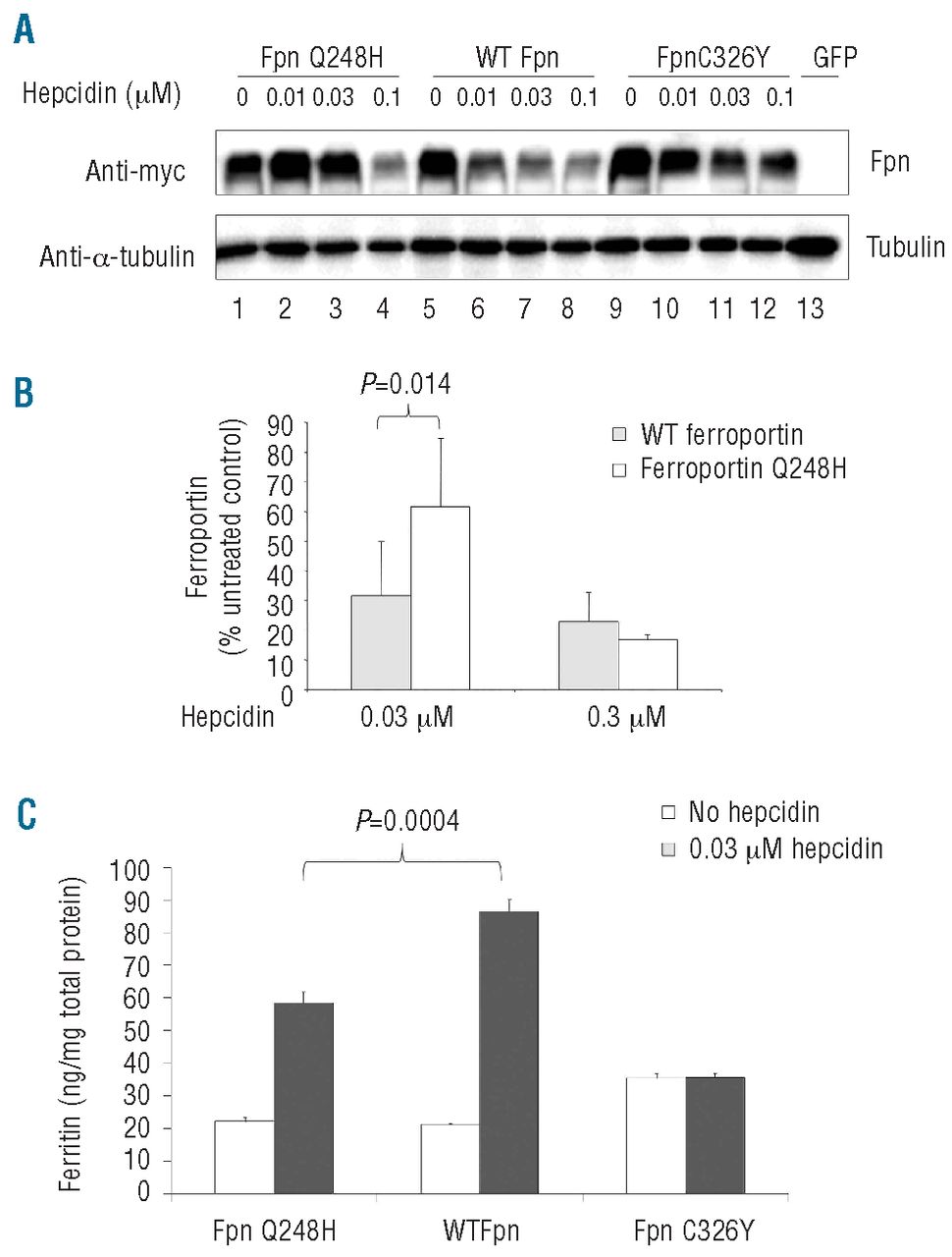 Figure 2A,B.Ferroportin Q248H-EGFP is resistant to hepcidin. Ferroportin WT and mutants Q248H or C326Y EGFP-fused proteins were expressed in 293T cells and treated with hepcidin at 37°C for 4 h. EGFP fluorescence was measured in live cells as described in the Design and Methods section. (A) Measurement of EGFP fluorescence showed significantly increased expression of ferroportin (FPN) C326Y-EGFP compared to FPN WT-EGFP at hepcidin concentrations of 0.01, 0.03 and 0.1 μM. FPN Q248H-EGFP was also increased at these hepcidin concentrations but less so than FPN C326Y. (B) Expression of ferroportin was analyzed by immunoblotting with anti-EGFP antibody and compared to the loading control with anti-α-tubulin antibody. Compared to ferroportin WT, ferroportin Q248H had reduced sensitivity to 0.03 μM hepcidin but not to 0.3 μM hepcidin.