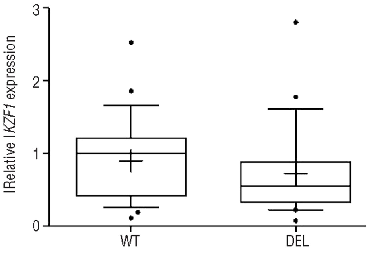 Figure 2.Gene expression values for IKZF1 by RQ-PCR in patients with (DEL) and without (WT) IKZF1 deletions. Boxes include 10–90 percentile, mean (internal line) and median (cross) are shown. Dots indicate outliers.