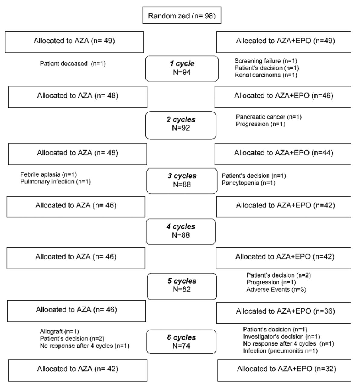 Exclusion criteria are listed in the Online Supplementary Information. This trial was registered in both the EudraCT (2008-004541-29) and the Clinical trial databases (GFMAzaEpo-2008-1 trial, clinicaltrials.gov identifier: 01015352) and was approved by an ethics committee (CPP Ile de France, Aulnay sous Bois) and L’Agence Nationale de Sécurité des Médicaments (ANSM), according to French regulations and in accordance with the Declaration of Helsinki. Each patient provided written informed consent.
