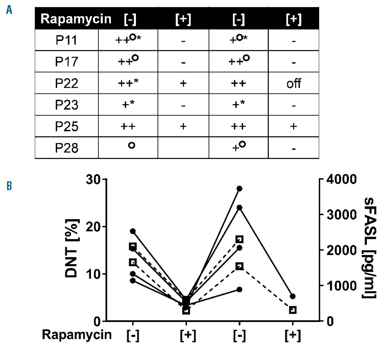Figure 2.Effect of treatment discontinuation. Summary of observations in 6 patients who discontinued rapamycin treatment. (A) Status of rapamycin treatment is indicated by [−]/[+]. The spleen size is indicated as follows: − not palpable; + palpable but <5 cm; ++ >10 cm or up to umbilicus. °Additional lymphadenopathy. *Cytopenia. (B) Percentages of DNT cells (left y-axis, black circles) and sFASL levels (right y-axis, open boxes/broken lines) at different stages of therapy.