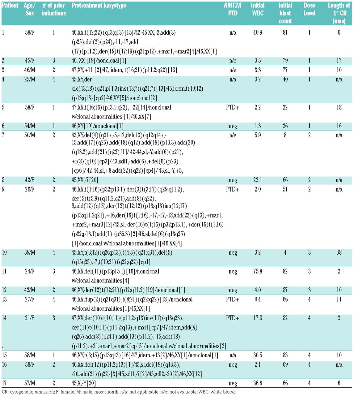 Seventeen adults with relapsed/refractory AML were treated on this phase I study. The median age of patients was 46 years (range, 21–59 years). Median white blood cell count and bone marrow blast percentage was 3.5 × 10/μL (range, 0.4–75.8) and 66% (range, 4–87%), respectively. The median number of prior induction therapies was 2 (range, 1–4). All patients had previous anthracycline exposure, and 15 patients had previous high-dose cytarabine exposure. Twelve patients had relapsed disease, with 8 patients having prior CR1 duration of less than 1 year and 4 patients experiencing CR1 ranging from 16–38 months. Five patients had primary refractory disease; each one entered the study after failure of at least 2 conventional regimens. One patient had undergone prior allogeneic stem cell transplant and 2 patients had undergone autologous transplant in CR1 (on study protocols). Two patients had secondary or therapy-related AML, 14 patients had abnormal karyotypes and 4 patients were found to have KMT2A PTD molecular subtype. Clinical as well as pre-treatment cytogenetic and molecular characteristics of enrolled patients are summarized in Tables 2 and 3.