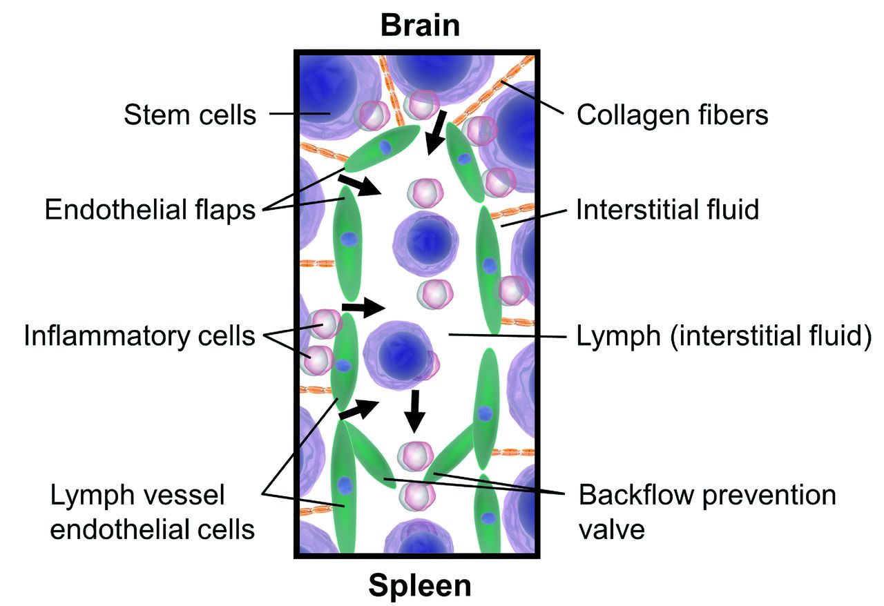 Figure 8.Illustration demonstrating how stem cells migrate from the brain to the spleen via lymphatic vessels and with guidance from inflammatory cells. Stem cells engrafted in the brain enter lymphatic vessels in the brain and inflammatory cues direct the transplanted stem cells toward the spleen.