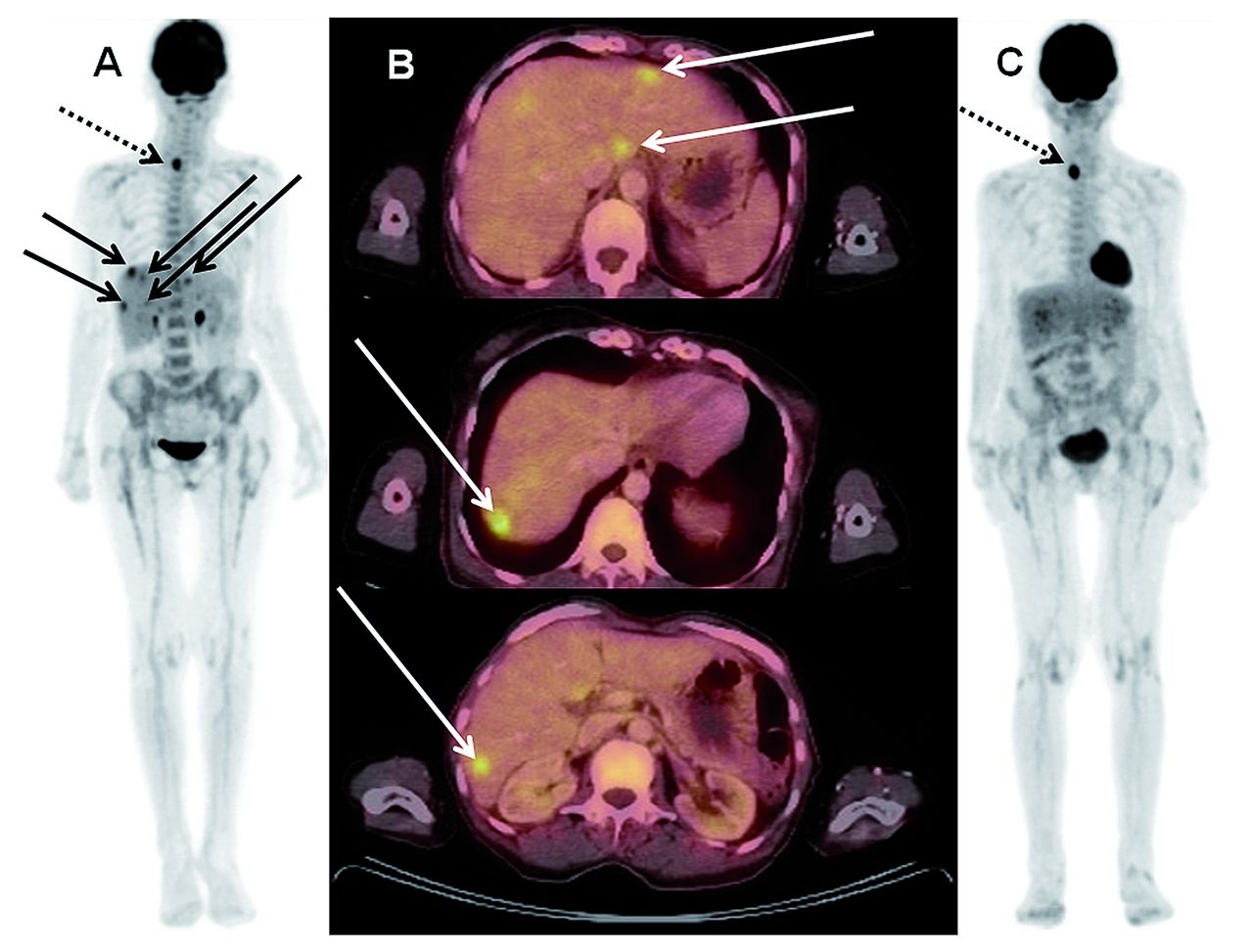 Figure 2.Images of a 69-year old female patient with histologically confirmed extramedullary (EM), bilobular hepatic manifestations of acute myeloid leukemia (AML) (continuous arrows) who underwent intensive induction chemotherapy. (A) Maximum intensity projection (MIP) and (B) three representative slices of the fused multiplanar reconstructions (MPR) of the pre-therapeutic 18Fluorodesoxy-glucose positron emission tomography/computed tomography (18FDG-PET/CT). Maximum standardized uptake value (SUVmax) ranged from 5.2 to 7.4. (C) MIP of the post-therapeutic 18FDG-PET/CT confirming a complete metabolic remission of all hepatic lesions. Note the hypermetabolic focus (SUVmax 8.9) in the right thyroid lobe (dotted arrows, see also (A) at baseline) which does not reflect AML but rather a thyroid adenoma that was still present in the post-therapeutic scan (SUVmax 8.1).